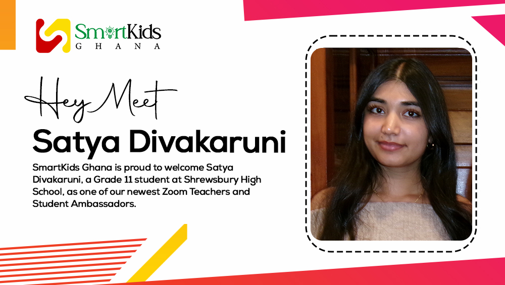 SmartKids Ghana is proud to welcome Satya Divakaruni, a Grade 11 student at Shrewsbury High School, as one of our newest Zoom Teachers and Student Ambassadors.