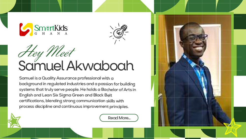 With over three years of experience in quality-focused environments, Samuel applies a structured, analytical lens to complex organizational needs. He prioritizes accountability, sustainability, and measurable outcomes believing firmly that effective humanitarian work requires both heart and operational rigor. His expertise in process optimization and performance measurement will directly benefit Smart Kids Ghana by strengthening internal systems, enhancing program evaluation frameworks, improving operational efficiency, and ensuring that every initiative delivers measurable value to the children and families we serve.