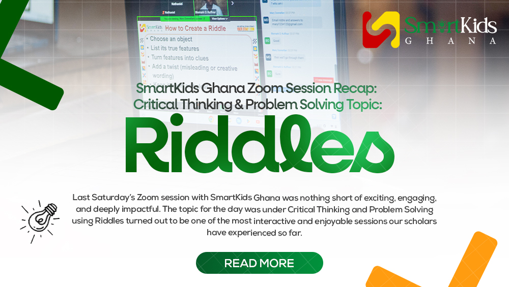 Last Saturday’s Zoom session with SmartKids Ghana was nothing short of exciting, engaging, and deeply impactful. The topic for the day was under Critical Thinking and Problem Solving using Riddles turned out to be one of the most interactive and enjoyable sessions our scholars have experienced so far.